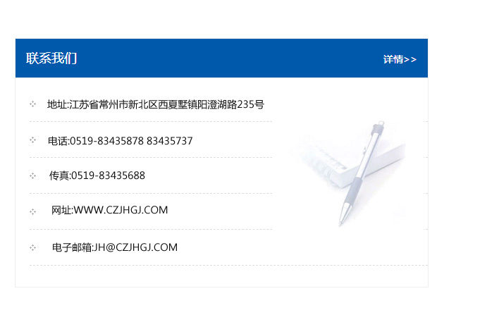 地址:常州市新北區友邦商務大廈1幢16、17層  電話:0519-85101652  傳真:0519-85112595  郵編:213022  網址:www.cz-jiayue_cn.js3you.com  郵箱:xiajifengaa@163.com
